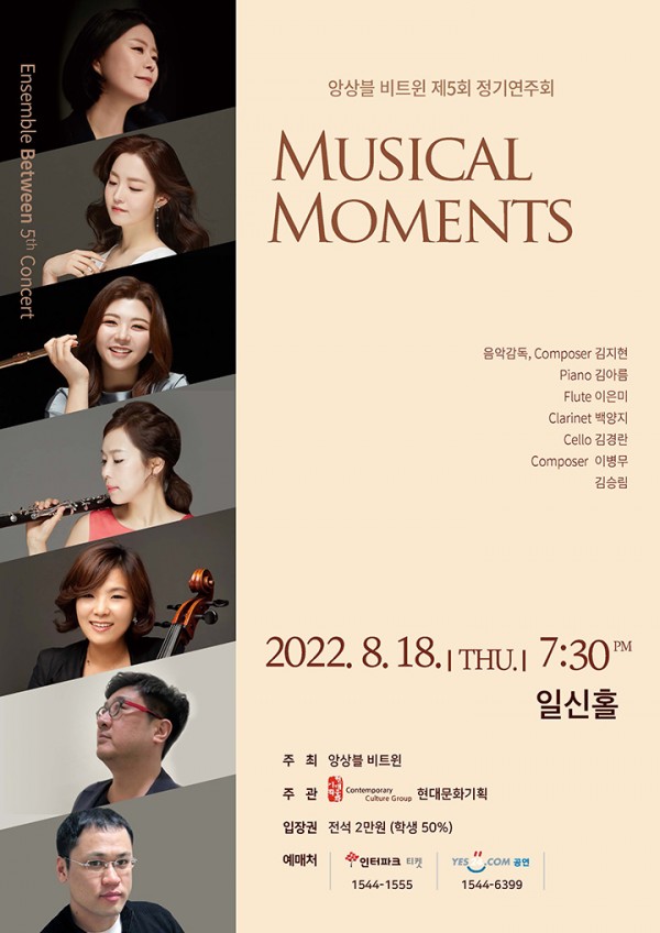 앙상블 비트윈(Ensemble Between)은 음악을 통해 사람들의 감동을 이끌어 내고자 하는 공통의 관심과 뜻을 갖고 있다. 이은미(플루트), 백양지(클라리넷), 김경란(첼로), 김아름(피아노)와 김지현 (음악감독)이 앙상블의 멤버로 연주자 개개인의 역량을 넘어서, 연주자 사이의 교감과 소통으로 인한 하나의 호흡과 그 합으로 만들어지는 음악을 추구한다. 이번 연주회의 부제는 “Musical Moments”로 Darius Milhaud, C. M. von Weber의 곡과 작곡가 김지현, 김승림, 이병무에게 위촉한 세계 초연곡들이 연주된다. 연주회의 모든 관객들도 의미 있는 musical moments로 느끼며 소통하는 연주회가 되길 바란다.