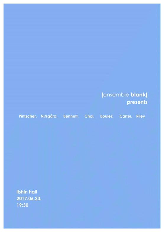 앙상블 블랭크는 줄리어드 음악원, 커티스 음악원, 예일대학교, NEC, 서울대학교, 한국예술종합학교 등 세계 정상의 학교 출신의 젊은 음악가들로 결성된 앙상블입니다. 20대의 패기 넘치는 음악가들의 진지한 음악적 연구를 기반으로 20세기 음악과, 21세기 음악, 그리고 현존하고 있는 작곡가들의 작품을 초연하며 새로운 음악의 본질적 의미와 미학을 관객 여러분께 소개하고자 합니다. 앙상블이 성장함에 따라 여러 장르의 현대 예술을 복합적으로 시도 할 수 있는 다양한 분야의 작가들의 실험의 장이 될 것입니다..
