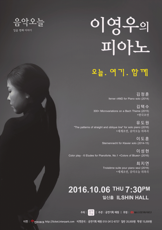 음악오늘에서는 일곱 번째 이야기로 현대음악 분야에서 눈에 띄는 프로그램과 기량으로 호평받고 있는 피아니스트 이영우를 초대하여 김정훈, 김택수, 유도원, 이도훈, 최지연, 젊은 작곡가 이성현 등의 곡으로 구성된 한국 작곡가의 2014~16년 작곡 된 피아노 레파토리로 음악회를 구성하였습니다. 작곡가 최지연, 유도원이 위촉곡을 작곡하여 세계초연하며 김택수의 곡을 한국초연합니다.