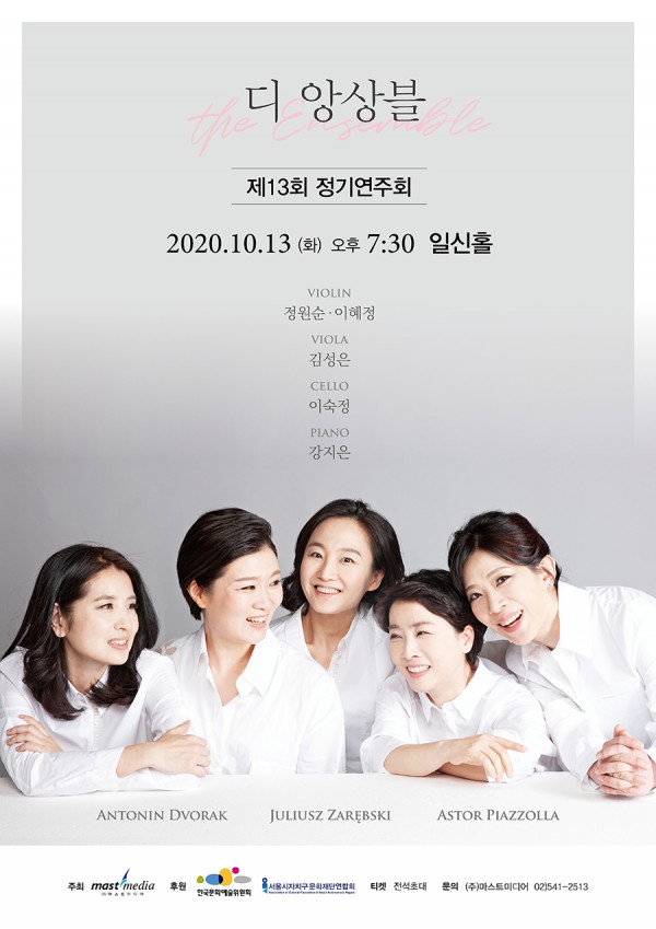 '디 앙상블(The Ensemble)'은 실내악에 대한 기쁨과 사랑을 전하고자 창단된 단체로서 국내외 유수의 단체들에서 리더 혹은 수석을 겸하고 있는 최정상의 아티스트들로 구성되어 있습니다. 디 앙상블은 곡에 대한 깊이 있는 해석을 기반으로 다양한 편성의 음악을 청중에게 전달하며 바로크부터 현대음악에 이르는 폭넓은 장르의 음악을 연주하고 국내외 창작 음악의 초연을 통해 음악적 입지를 확고히 하고자 합니다. 디 앙상블은 지난 2013년 예술의전당에서 창단연주회를 가진 이래, KT챔버시리즈 초청연주, 마리아 칼라스 홀 초청 쳄버 페스타 연주, 평촌아트홀 초청 연주, 신세계 문화홀 초청 신년음악회, 문화관광부 세종시 초청연주 등의 다양한 활동을 통해 깊이 있는 음악과 단원 간의 호흡으로 큰 찬사를 받고 있습니다. 2013년부터 매년 가진 '헌정 시리즈’는 우리시대의 사회적 이슈들을 돌아보고, 소외되고 고통받는 이들에게 용기를 주고 감사의 마음을 나누고자 하는 목적으로 기획된 시리즈입니다. 앞으로도 디 앙상블은 연주의 수익금 일부를 뜻 깊은 일에 기부하며 음악을 통해 따뜻한 나눔을 실천할 계획입니다.